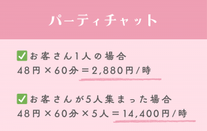 パーティチャットより1人あたりの単価が高いので、長時間チャットすることでしっかり稼げます…!